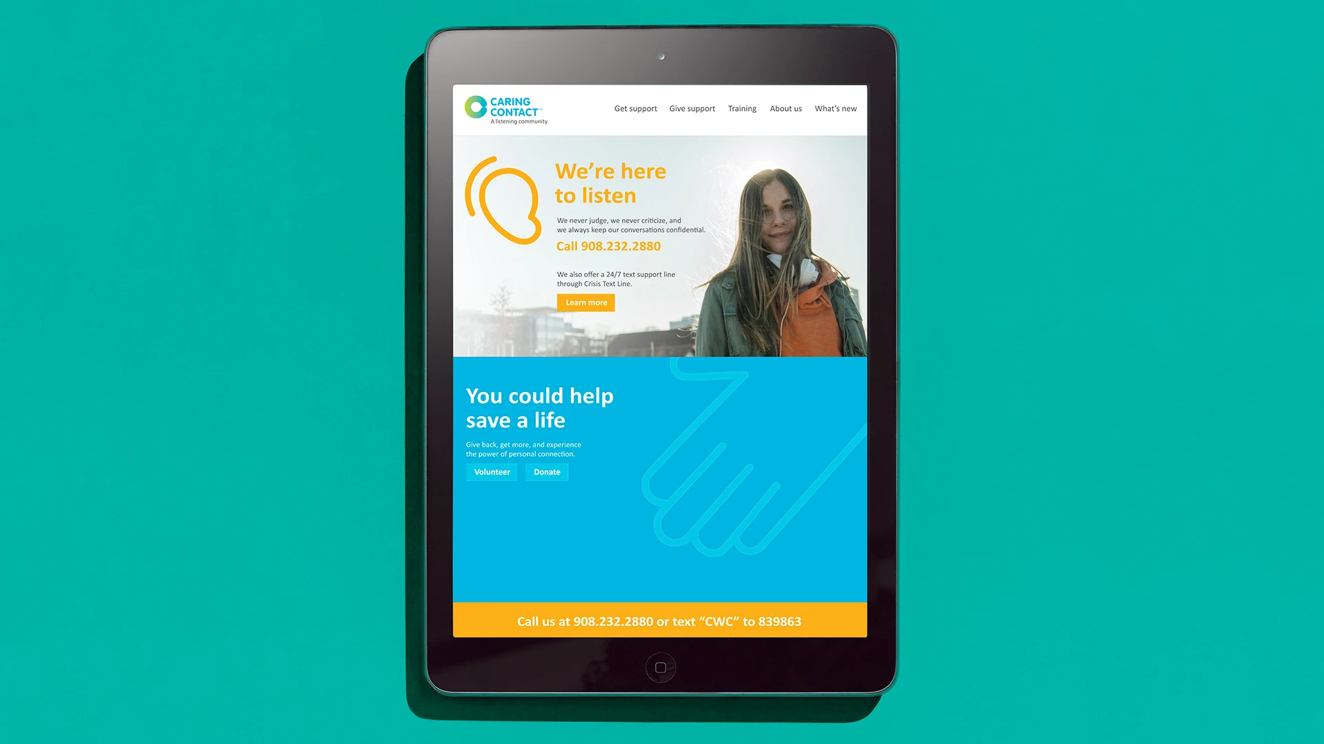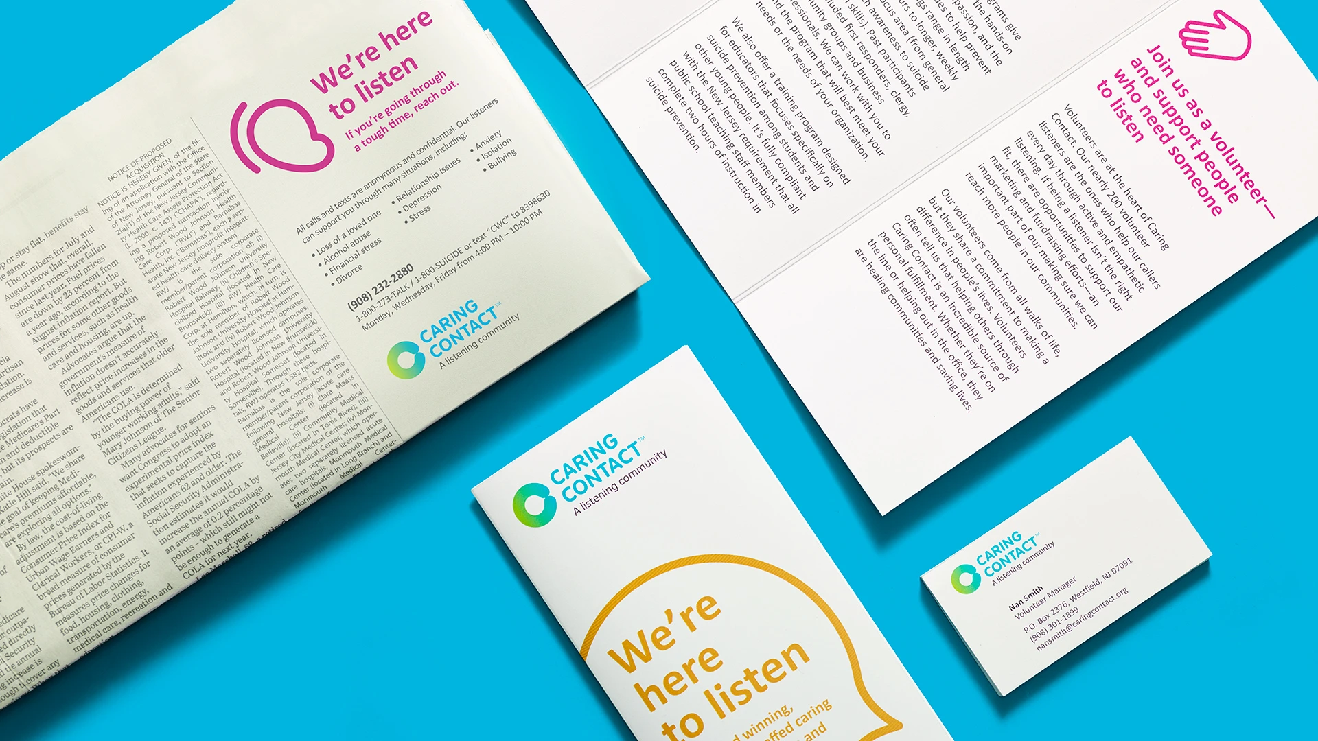 The new identity created a welcoming and recognizable presence for Caring Contact, helping the organization communicate its mission of compassionate listening and emotional support more clearly across its programs and community resources.